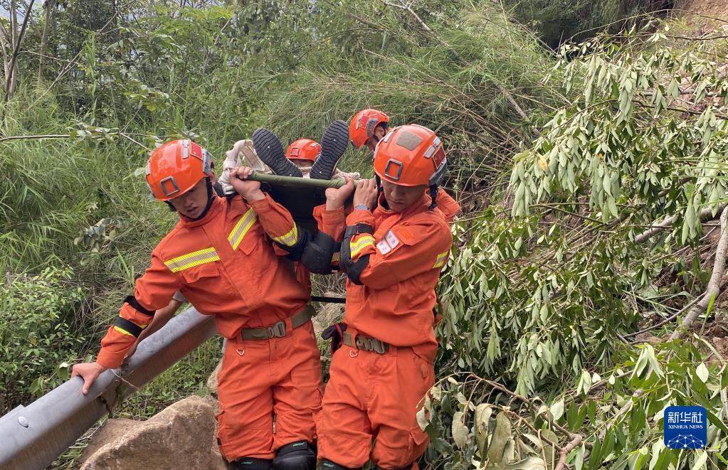 9月6日,四川森林消防總隊甘孜支隊消防員在瀘定縣得妥鎮(zhèn)紫雅場村轉(zhuǎn)運傷員。新華社 魏紅 攝