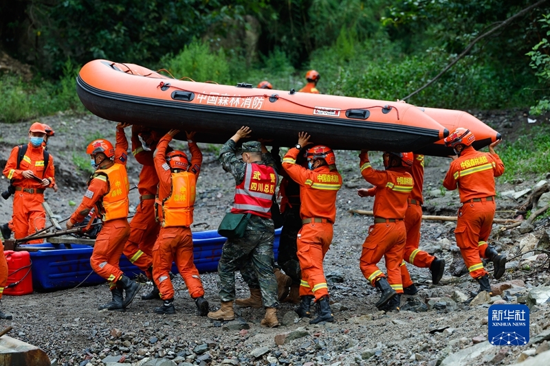 9月6日,救援隊(duì)伍正在合力將橡皮艇運(yùn)往河邊,從水路繞過(guò)損毀道路。新華社記者 沈伯韓 攝