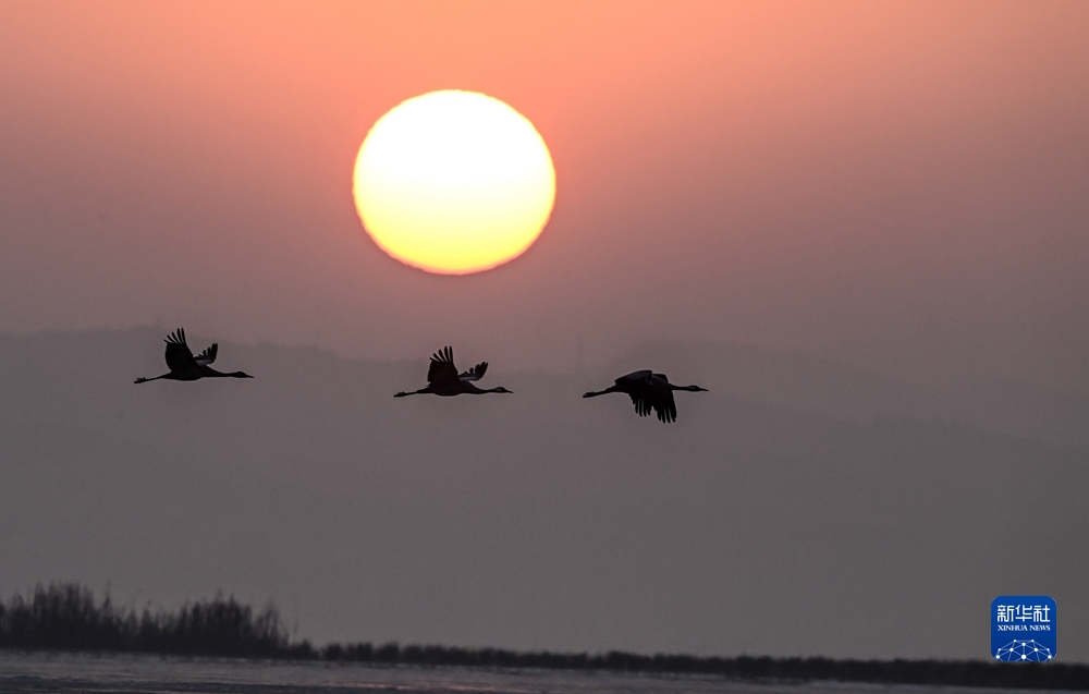 在貴州草海國家級(jí)自然保護(hù)區(qū)迎著朝陽起飛的黑頸鶴(2021年1月13日攝)。新華社記者 楊文斌 攝