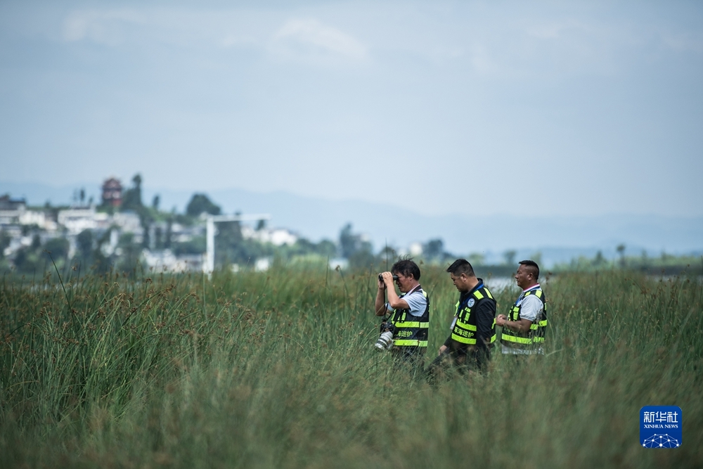 貴州草海國家級(jí)自然保護(hù)區(qū),草海巡護(hù)隊(duì)副大隊(duì)長(zhǎng)劉廣惠(左一)和隊(duì)員在日常工作巡護(hù)中(2021年7月8日攝)。新華社記者 陶亮 攝