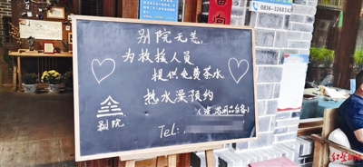“古道別院”工作人員唐莎告訴記者,地震發(fā)生后,民宿就把客房提供給了救援人員住宿,也提供免費(fèi)茶水、咖啡,同時給救援人員和當(dāng)?shù)鼐用裉峁┫丛璧牡胤健?/p>
