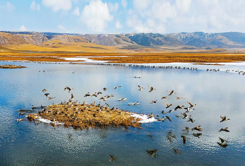 雪后陽光下,數(shù)千只飛禽在若爾蓋花湖嬉戲翱翔。 四川日報(bào)全媒體記者 尹鋼 攝(資料圖片)