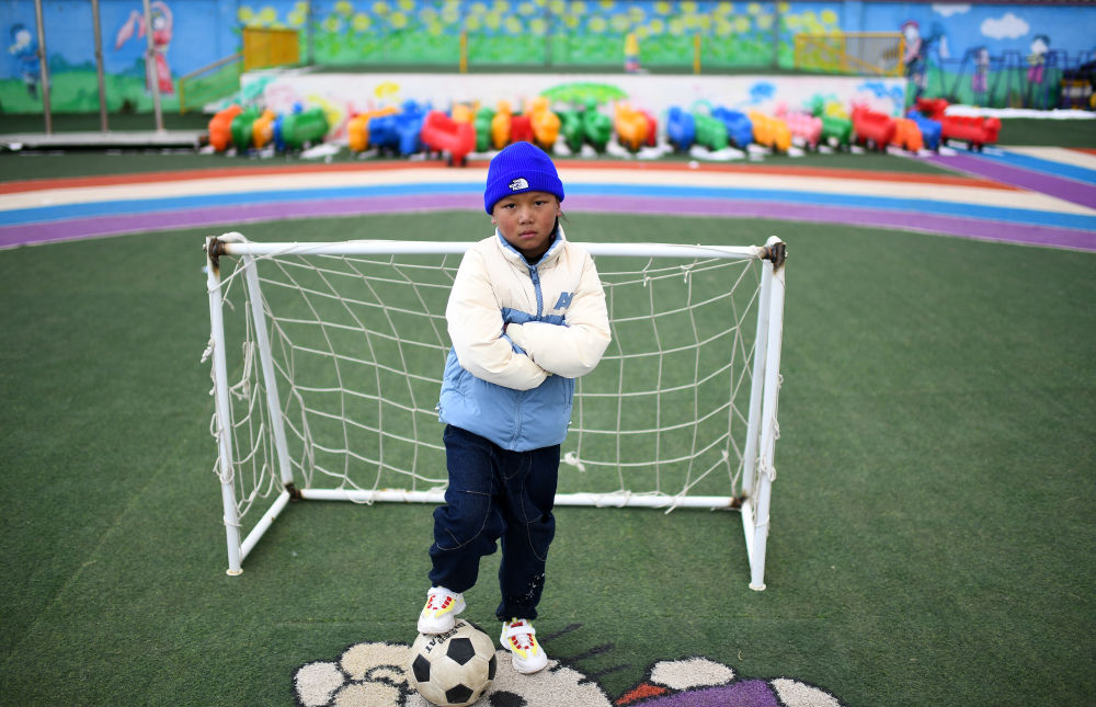 3月1日,在玉樹州治多縣,城南幼兒園小朋友旦增然桑(左一)在練習(xí)射門。新華社記者 張宏祥 攝