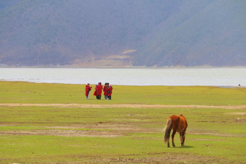 春分節(jié)氣前后,香格里拉氣溫回暖,納帕海的草原也逐漸染綠,游客們?cè)谛蕾p草原春景的同時(shí)也不忘合影留念。