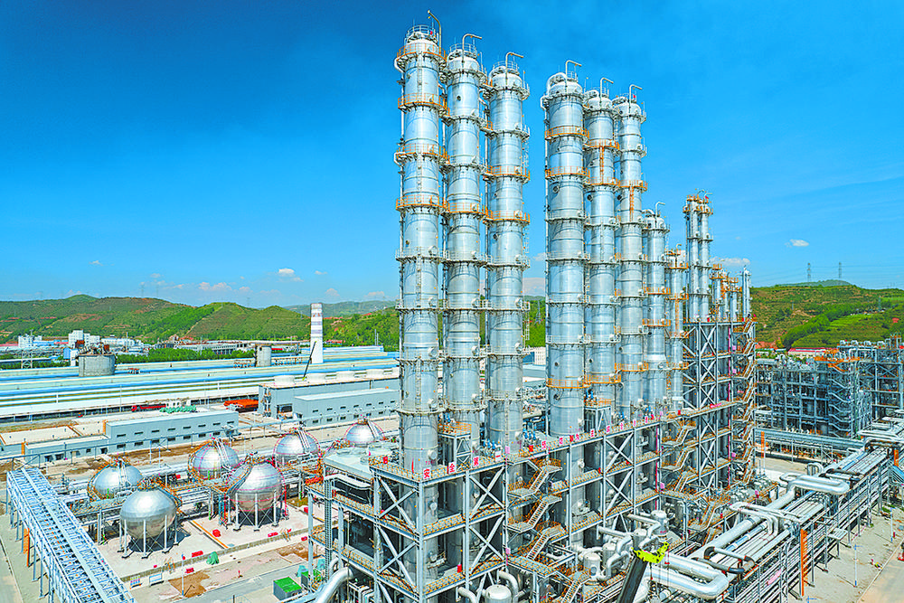 碧藍天空下,一個個標準化車間錯落有致,一排排提純精餾塔巍然聳立,粗細不一的銀色管道在廠區(qū)內(nèi)相互編織盤旋,罐區(qū)在“綠電”驅(qū)動下各自忙碌,運轉(zhuǎn)的循環(huán)水站奏響春季“生產(chǎn)之歌”……