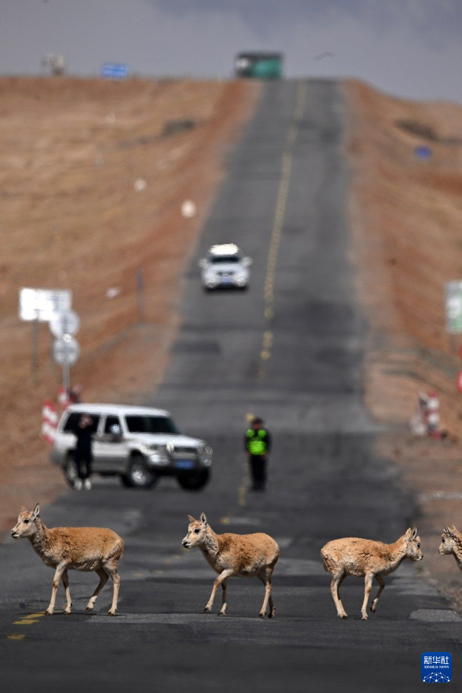 眼下,可可西里藏羚羊進(jìn)入遷徙產(chǎn)仔高峰期,記者近日在青藏公路3001公里處看到,成群的雌性藏羚羊在公路一側(cè)集結(jié),現(xiàn)場的工作人員對往來車輛進(jìn)行臨時(shí)交通管制。頭羊反復(fù)試探、確認(rèn)沒有危險(xiǎn)后,羊群快速通過公路,向可可西里腹地奔去。