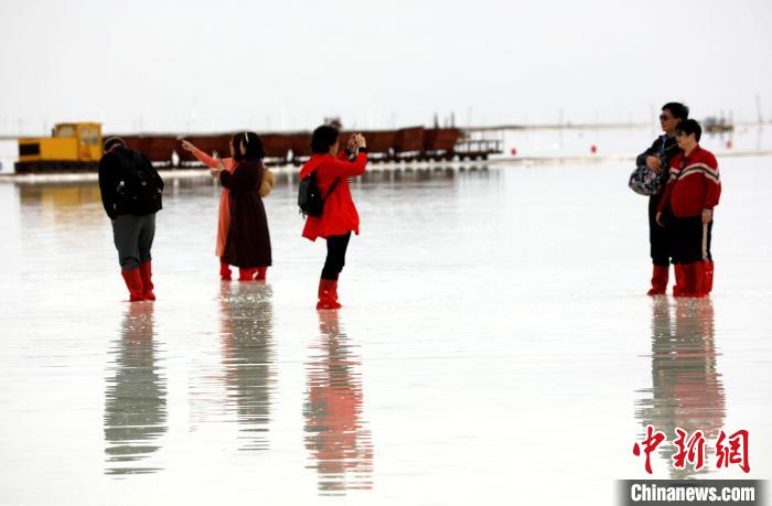 圖為茶卡鹽湖景區(qū)內(nèi),游客合影留念。 薛蒂 攝