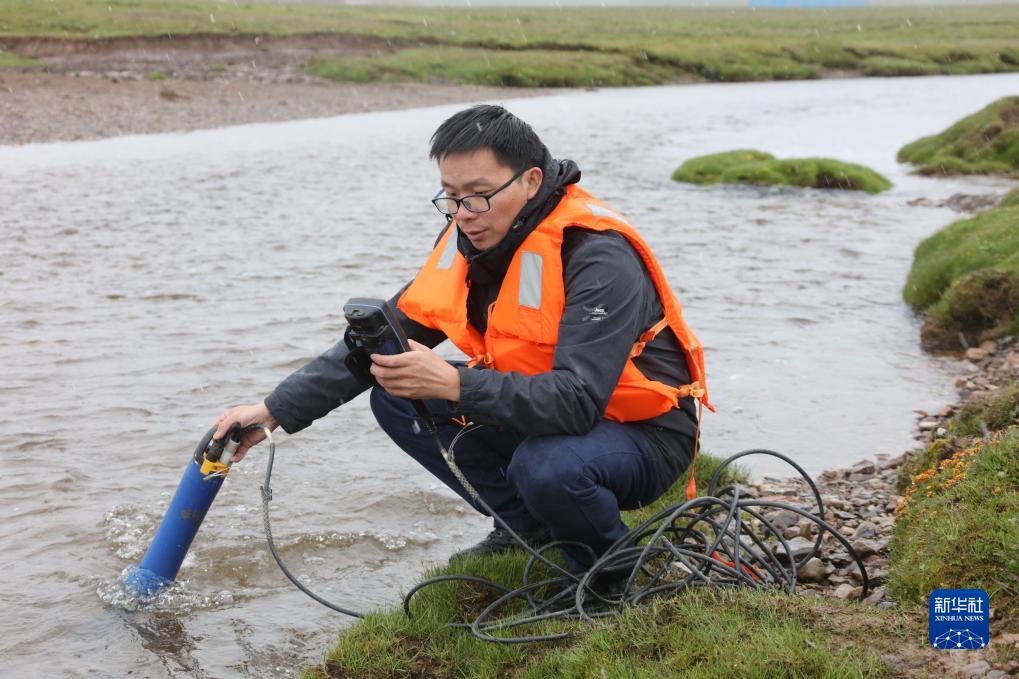 2023年江源綜合科學考察隊隊員劉敏在當曲濕地檢測水質(zhì)(7月24日攝)。新華社記者 劉詩平 攝