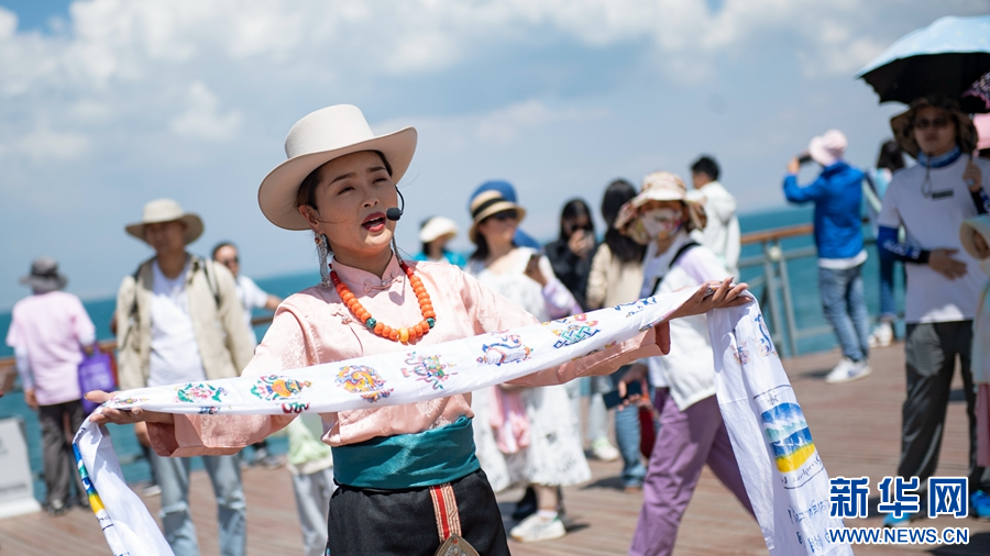 8月2日,青海湖二郎劍景區(qū)工作人員為游客獻上精美的舞蹈。新華網(wǎng) 潘彬彬 攝
