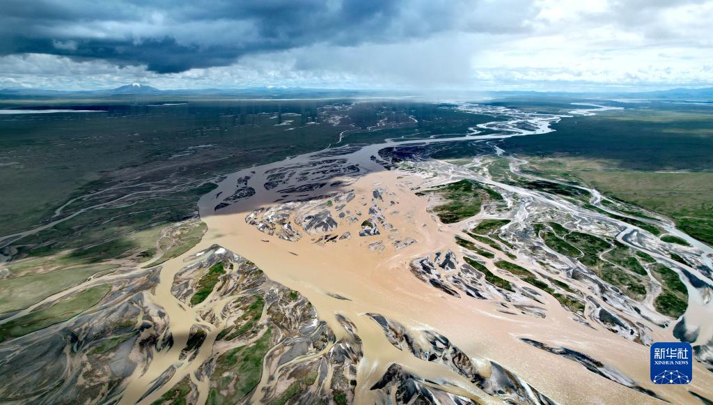 在沱沱河與當曲匯合處的囊極巴隴拍攝的辮狀河道(7月27日攝,無人機照片)。新華社記者 劉詩平 攝