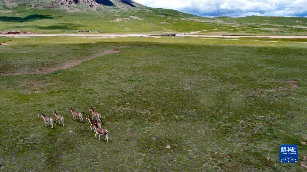 通天河支流辮狀河道旁的藏野驢(7月26日攝,無人機照片)。新華社記者 劉詩平 攝