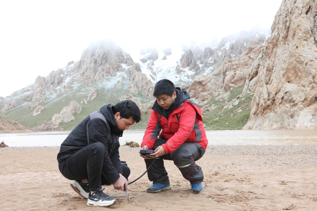 科考隊員董士琦(左)和范越在長江北源楚瑪爾河附近進(jìn)行地質(zhì)雷達(dá)探測(7月29日攝)。新華社記者 陳杰 攝