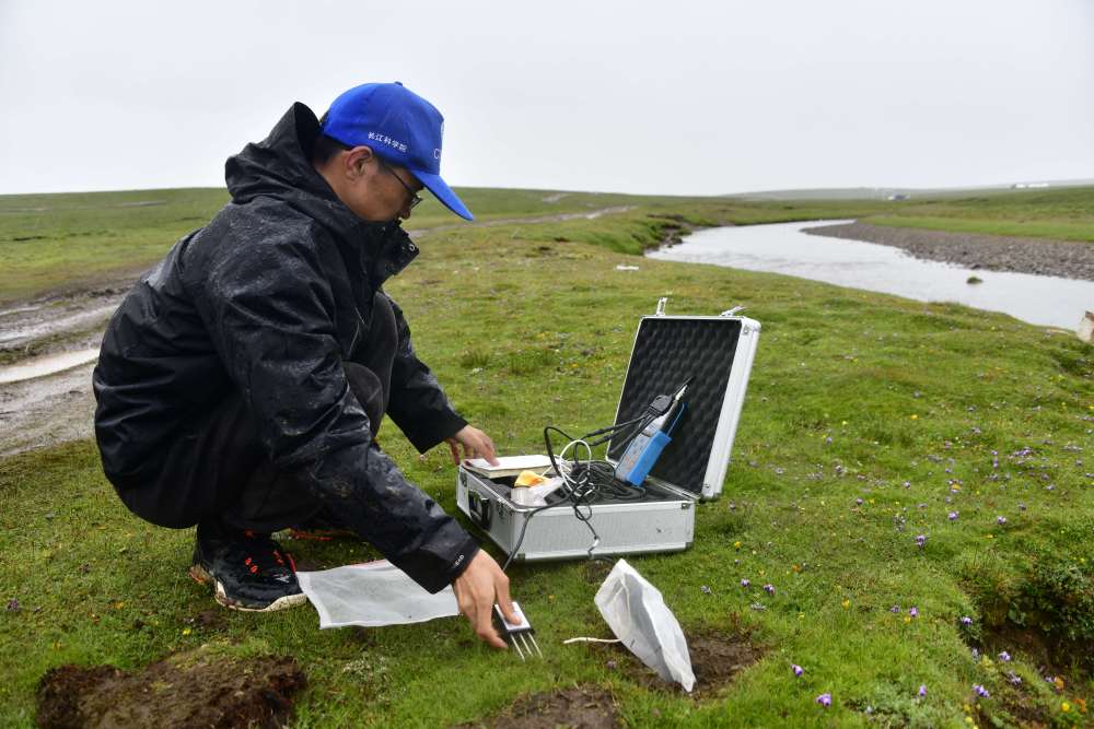 來自長江科學(xué)院空間信息技術(shù)應(yīng)用研究所的科考隊員張雙印在風(fēng)雨中觀測當(dāng)曲查旦濕地土壤指標(biāo)(7月24日攝)。新華社記者 李勁峰 攝