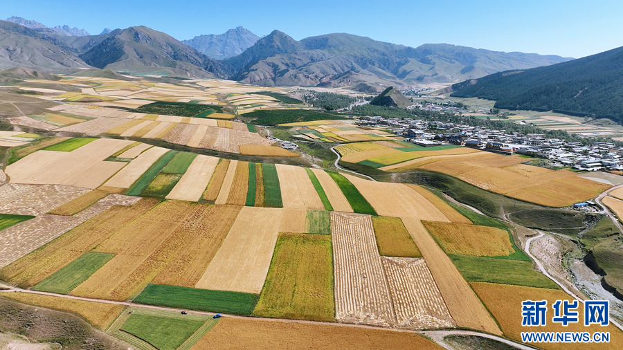 圖為航拍祁連山金色田野與山巒交相輝映。薛蒂 攝