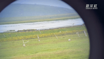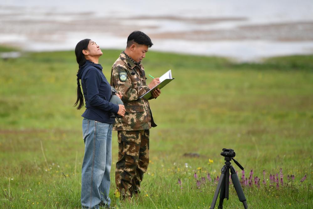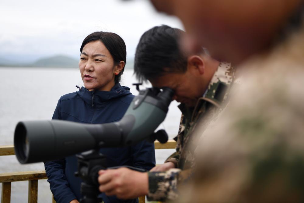甘肅尕海則岔國家級自然保護區(qū)管護中心尕海保護站站長香毛吉(左一)和同事在保護區(qū)內(nèi)用望遠(yuǎn)鏡觀測野生動物。 新華社記者 陳斌 攝