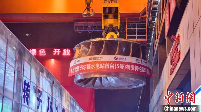 9月27日,瑪爾擋水電站首臺(tái)機(jī)組水輪機(jī)轉(zhuǎn)輪成功吊裝。(瑪爾擋水電站供圖)
