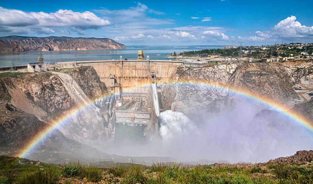 在海南州塔拉灘光伏發(fā)電園區(qū),蔚藍色的光伏板在陽光照射下熠熠生輝;幾十公里外,黃河上游的大型梯級電站龍羊峽水電站,黃河水奔流而下……