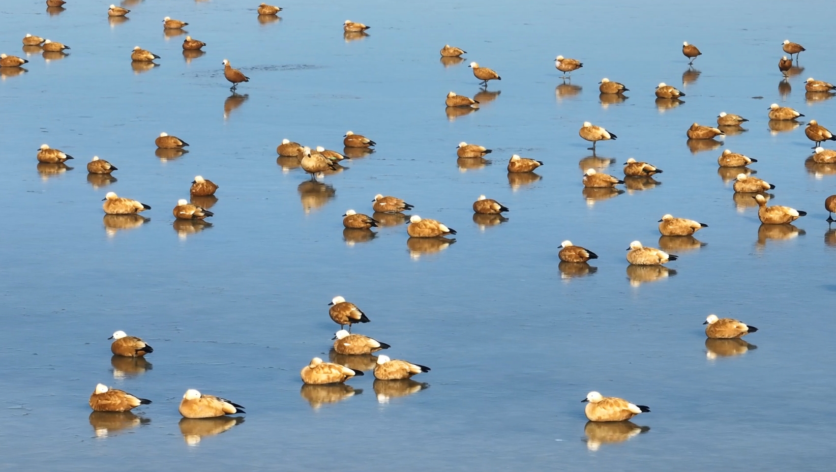 秋末冬初,昆侖山腳下的尕斯庫勒湖濕地迎來數(shù)千只赤麻鴨,它們在結了薄冰的湖面上或嬉戲,或休息,頗為愜意。
