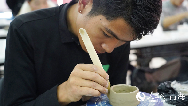 “平時家里開鋪子做生意,每月利潤也有四五千。最近鋪子生意不太忙,跟妻子一起來學(xué)習(xí),學(xué)會了也可以自己制作黑陶,增加收入?!苯鸫氲恼煞蚓妥谂赃叄叴蚰ヅ黧w上沿,邊講述自家情況,一件碗狀的坯體即將完工。