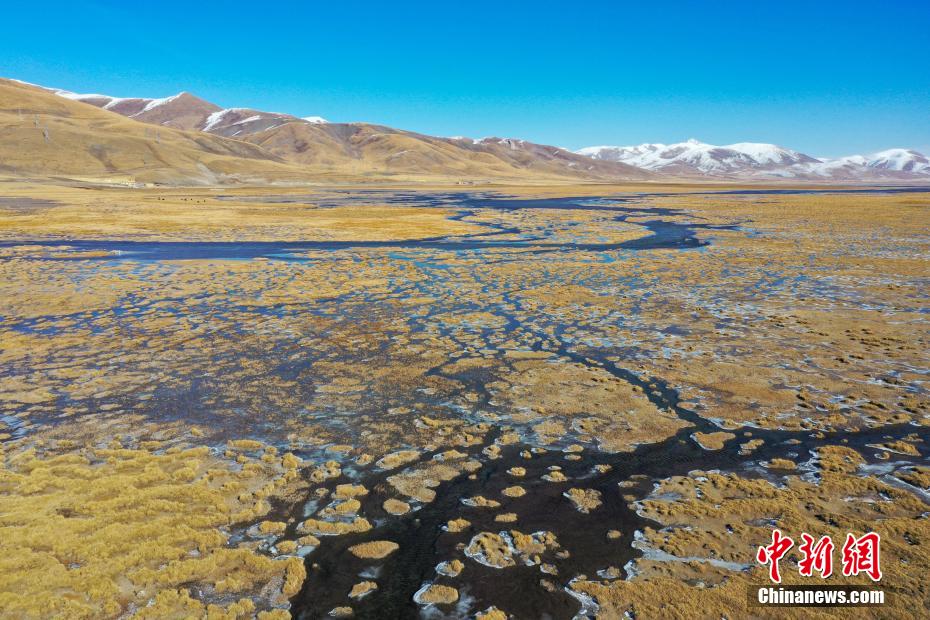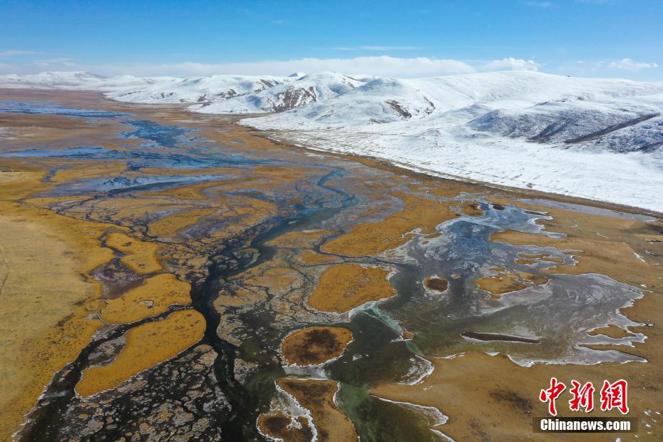 11月15日,航拍青海玉樹隆寶灘國際重要濕地冬日旖旎景色。降雪過后,位于青海省玉樹藏族自治州玉樹市境內(nèi)的隆寶灘國際重要濕地連綿的山巒被白雪覆蓋,與金色的草地和蜿蜒的河流交相輝映,景色旖旎。