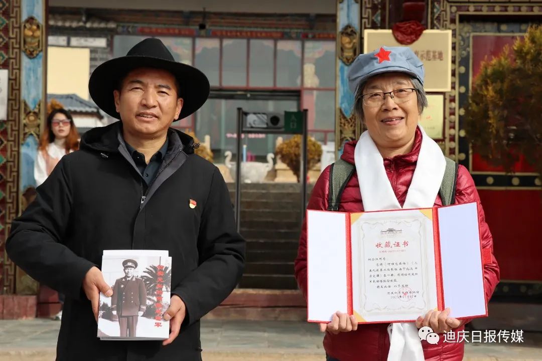迪慶紅軍長征博物館館長潘高原代表博物館接收了這些珍貴的革命資料、實物,向他們授予了榮譽證書并在博物館前合影留念。