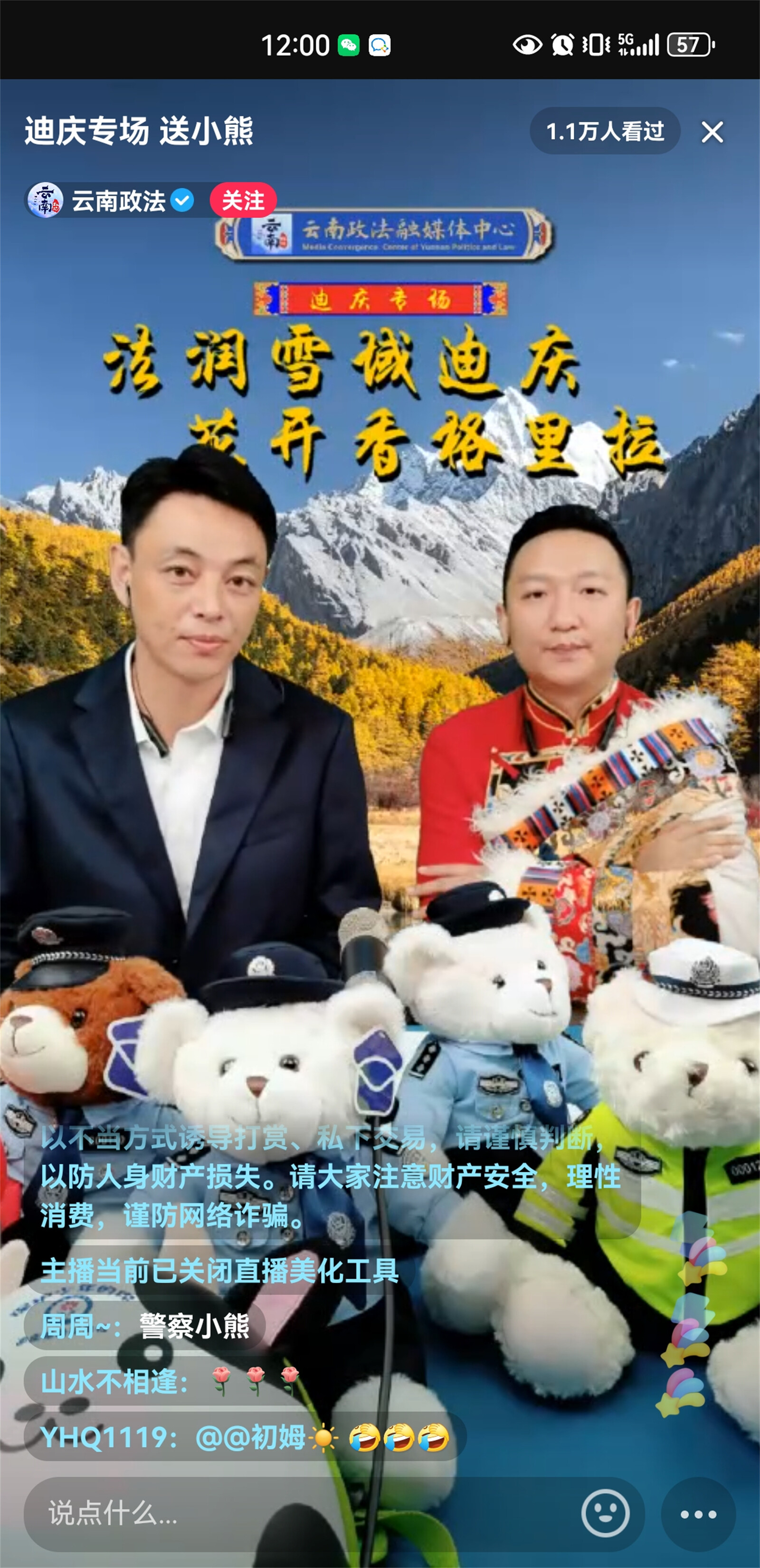 近日,迪慶州政法干警走進(jìn)云南政法普法強(qiáng)基直播間開展“法潤雪域迪慶、花開香格里拉”迪慶州普法專場直播,直播聚焦群眾關(guān)切,緊密聯(lián)系時(shí)事熱點(diǎn),帶廣大網(wǎng)友體驗(yàn)了一場內(nèi)容豐富的普法之旅,共吸引9.1萬人觀看,獲點(diǎn)贊超10.4萬。