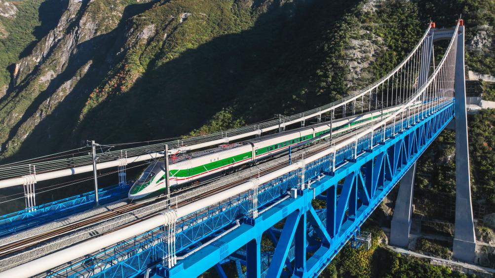 圖為11月9日,麗香鐵路動態(tài)檢測期間,復興號列車駛過虎跳峽金沙江鐵路大橋。(中國鐵路昆明局集團公司供圖)