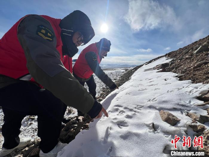 1月24日,管護(hù)員在巡護(hù)路上發(fā)現(xiàn)野生動物留下的腳印。中新社記者 李江寧 攝