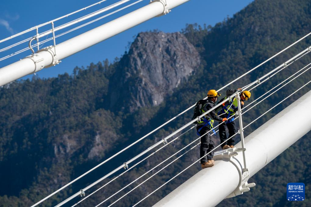 1月24日,工區(qū)職工劉榕基和工區(qū)班長楊應(yīng)文在主纜巡檢。新華社記者 陳欣波 攝