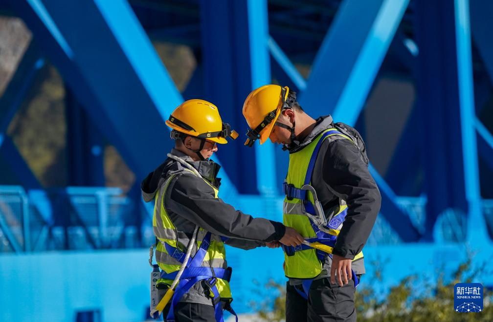 1月24日,工區(qū)班長楊應(yīng)文(左)在上主纜巡檢前為工友劉榕基檢查安全帶。新華社記者 陳欣波 攝