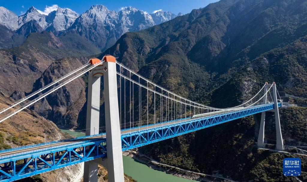 1月24日,列車通過虎跳峽金沙江鐵路大橋,遠(yuǎn)處是玉龍雪山(無人機(jī)照片)。新華社記者 陳欣波 攝