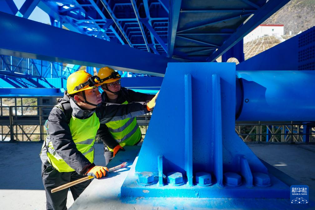 1月24日,工區(qū)職工趙澗泉(左)、羅星海在查看大橋阻尼器。新華社記者 陳欣波 攝