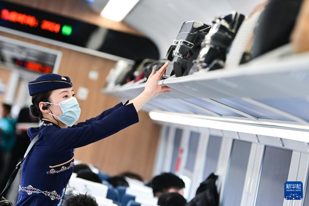 1月30日,中國鐵路青藏集團(tuán)有限公司西寧客運(yùn)段動車隊(duì)乘務(wù)員王璐在為旅客服務(wù)。新華社記者 張龍 攝