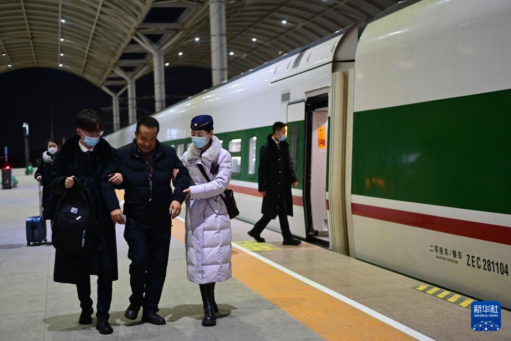 1月30日,中國鐵路青藏集團(tuán)有限公司西寧客運(yùn)段動車隊(duì)西格八組乘務(wù)員陳麗琴在協(xié)助重點(diǎn)旅客下車。新華社記者 張龍 攝