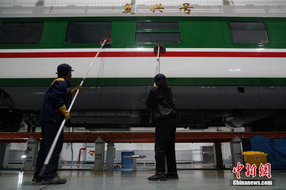 1月30日晚,在青藏鐵路公司西寧車輛段動(dòng)車運(yùn)用車間,工作人員在無電作業(yè)時(shí)進(jìn)行動(dòng)車清潔。中新社記者 馬銘言 攝