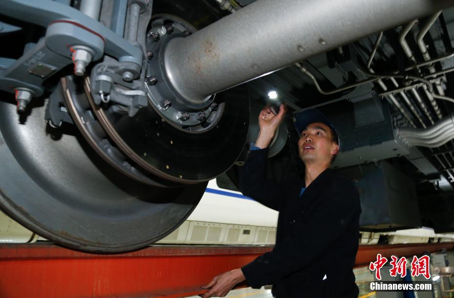 1月30日晚,在青藏鐵路公司西寧車輛段動(dòng)車運(yùn)用車間,地勤機(jī)械師在無電作業(yè)時(shí)進(jìn)行動(dòng)車組走行部關(guān)鍵部位的檢修。中新社記者 馬銘言 攝