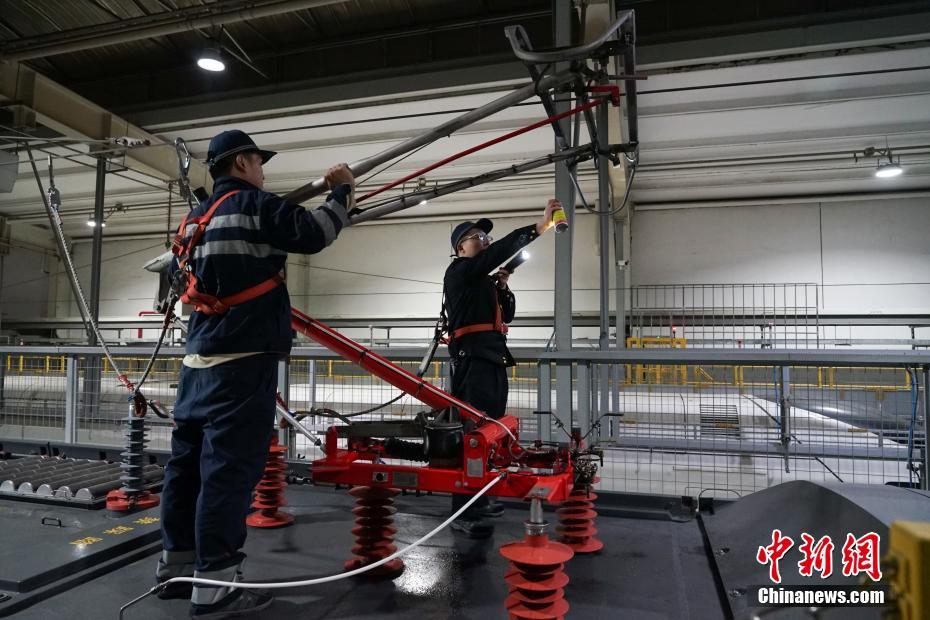 1月30日晚,在青藏鐵路公司西寧車輛段動(dòng)車運(yùn)用車間,地勤機(jī)械師在無電作業(yè)時(shí)進(jìn)行車頂受電弓的功能檢查及測漏檢測。中新社記者 馬銘言 攝
