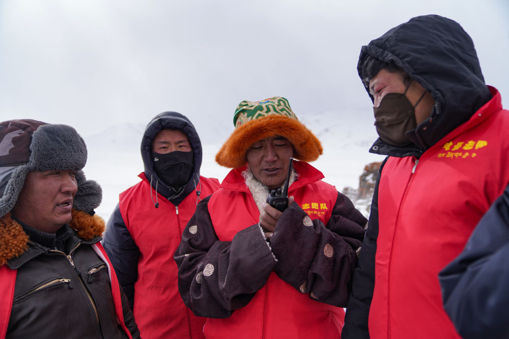 瑪曲鄉(xiāng)長(zhǎng)江源黨員環(huán)保志愿隊(duì)隊(duì)員在巡邏時(shí)通過(guò)對(duì)講機(jī)互相聯(lián)系(2024年2月2日攝)。新華社記者 晉美多吉 攝