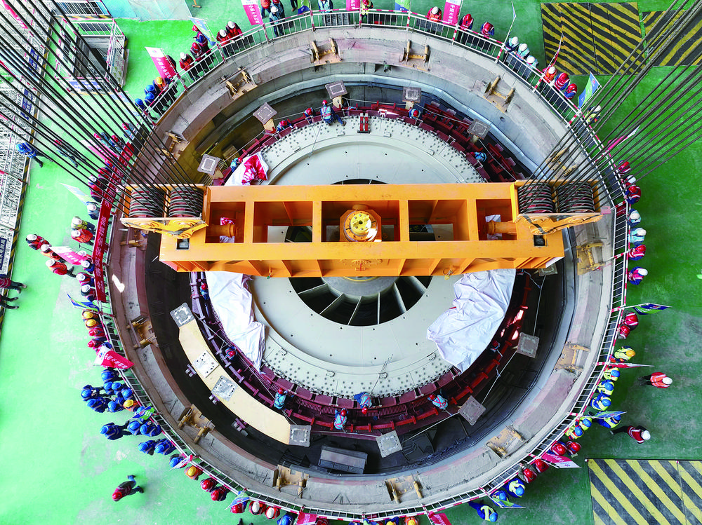 黃河羊曲水電站首臺(tái)機(jī)組轉(zhuǎn)子吊裝完成。 黃河公司供圖