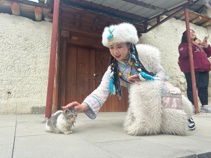 在景區(qū)內(nèi),隨處可見身穿藏族服飾、化上高原紅曬傷妝的游客們變身“扎西和卓瑪”,攝影師圍著她們忙前忙后,快門聲此起彼伏?!班牛谩薄熬褪沁@樣,保持笑容”“下巴揚起來”……在攝影師的引導(dǎo)下,““扎西和卓瑪””變換著姿勢,拍下一張張景區(qū)打卡照。