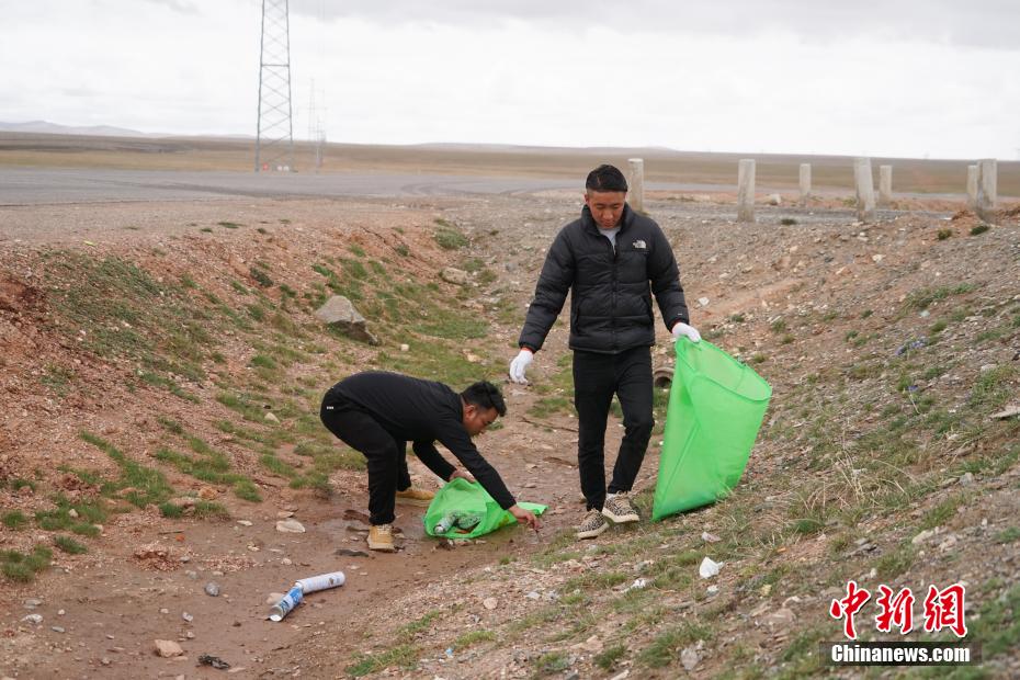 6月20日,三江源國家公園長江源園區(qū)可可西里管理處五道梁保護站2名生態(tài)管護員在青藏公路沿線撿拾垃圾。中新社記者 馬銘言 攝