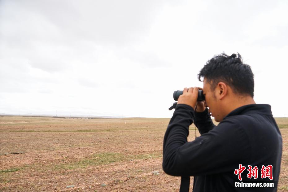 6月20日,三江源國家公園長江源園區(qū)可可西里管理處五道梁保護站附近,生態(tài)管護員德尕利用望遠鏡在藏羚羊重要遷徙通道——五北大橋附近察看是否有藏羚羊。中新社記者 馬銘言 攝