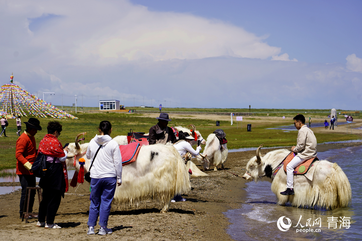 上班時間到,尕瑪本牽著白牦牛來到了青海湖景區(qū)的西湖灘,與其他村民家的二三十頭白牦牛排排站立在湖邊,靜待游客前來觀賞、騎行、拍照。