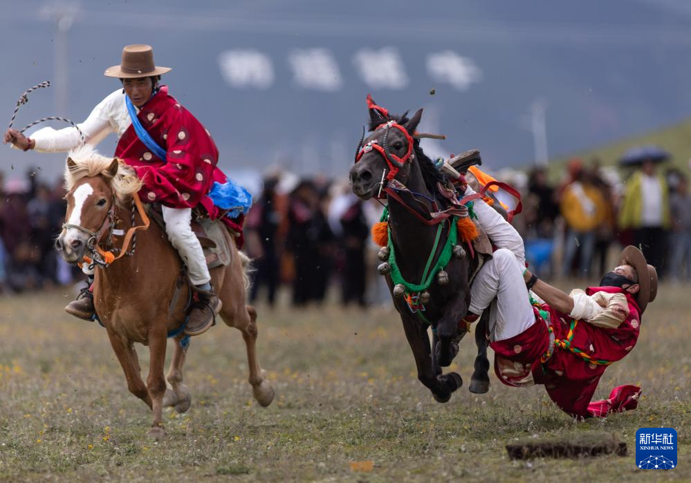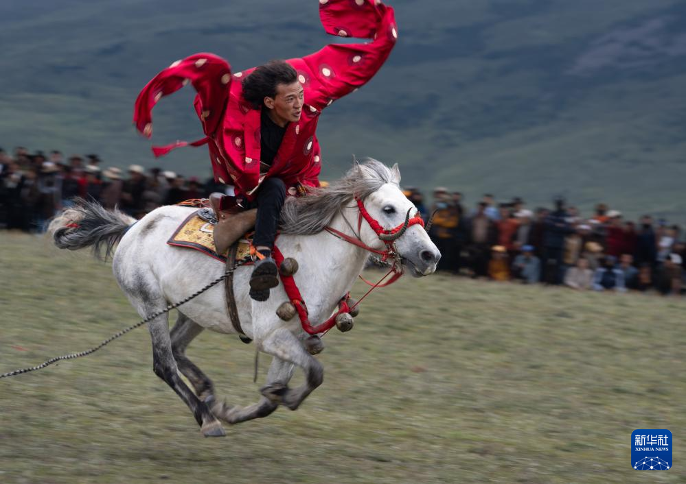 7月30日,四川省甘孜藏族自治州理塘“八一”賽馬會在多旺塘賽馬場啟幕,來自全縣各鄉(xiāng)鎮(zhèn)近千名牧民匯聚一堂。賽馬會上表演的拾哈達(dá)、馬上射擊、馬上射箭、鐙里藏身、五彩凌空等馬術(shù)絕技,讓當(dāng)?shù)啬撩窈陀慰拖硎芰艘粓鲆曈X盛宴。