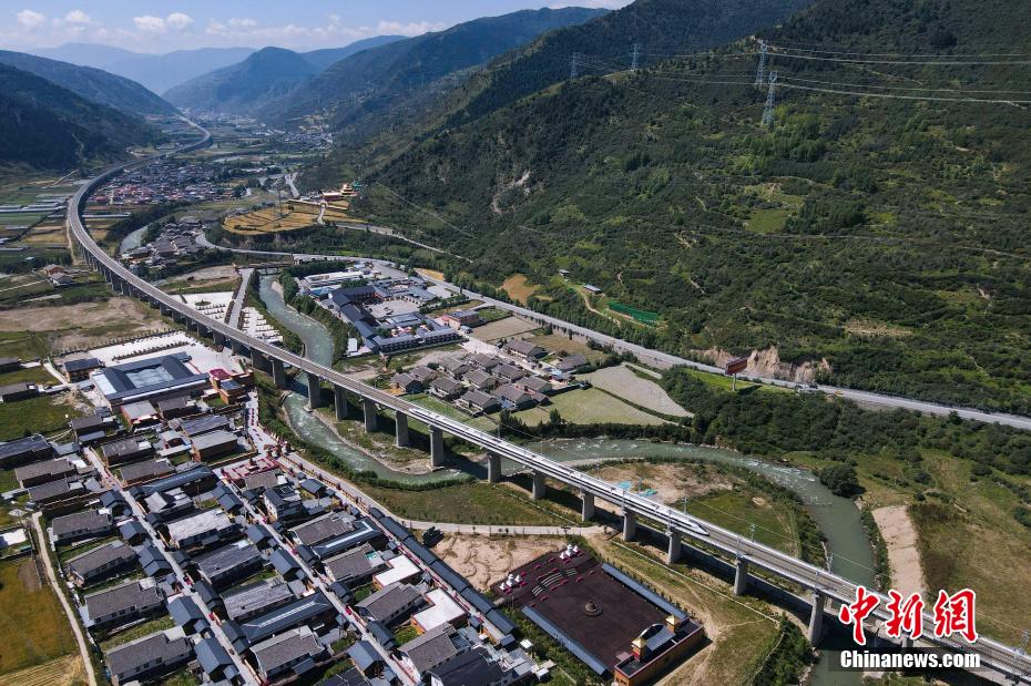 圖為一列動(dòng)車(chē)組運(yùn)行在川青鐵路黃龍九寨站至松潘站區(qū)間。(無(wú)人機(jī)照片)中新社記者 劉忠俊 攝