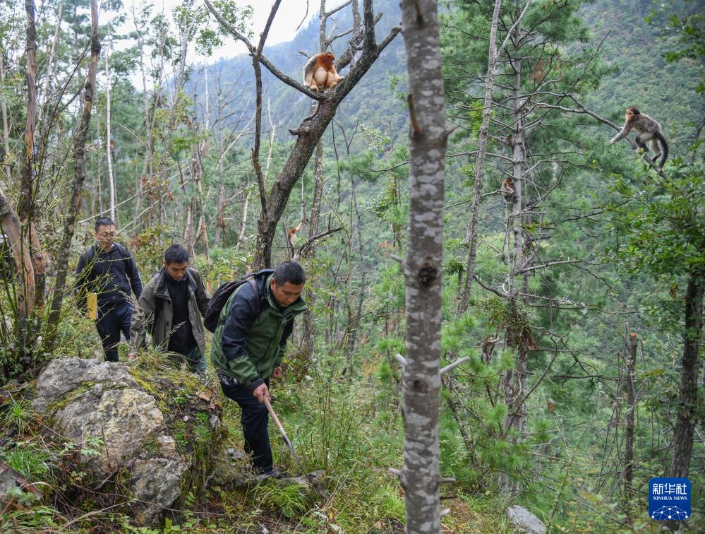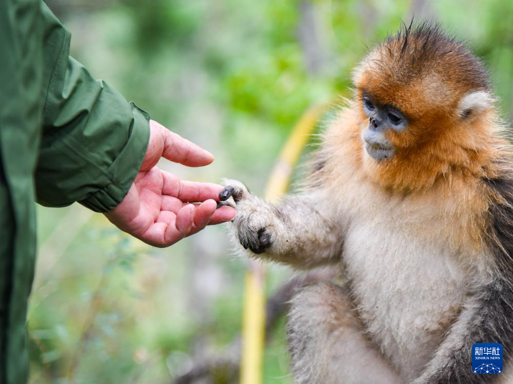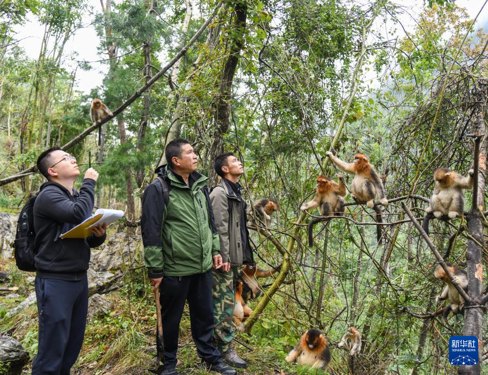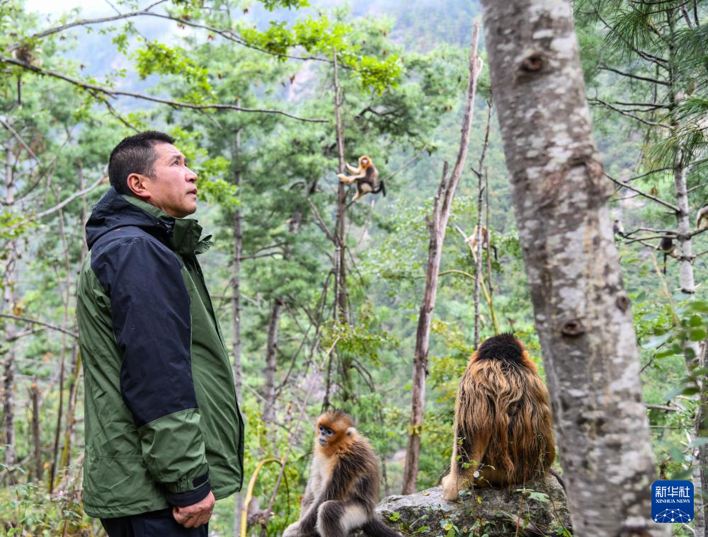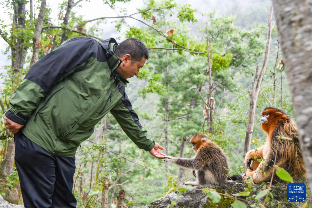 在四川白河國家級(jí)自然保護(hù)區(qū),唐玉林和川金絲猴互動(dòng)(10月11日攝)。新華社記者 王曦 攝