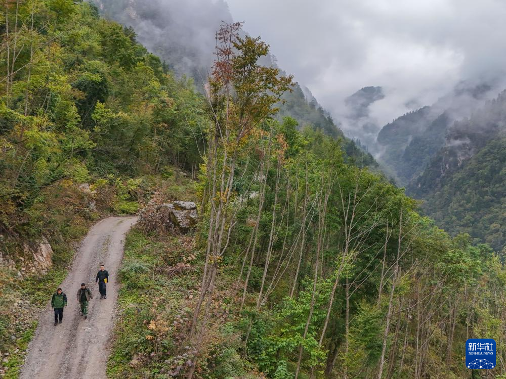 在四川白河國家級(jí)自然保護(hù)區(qū),唐玉林(左)、侄子唐小剛(中)和西華師范大學(xué)生物學(xué)研究生劉昕走在巡護(hù)的路上(10月11日攝)。新華社記者 王曦 攝