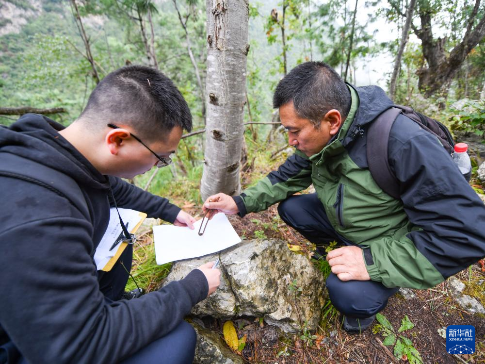 在四川白河國家級(jí)自然保護(hù)區(qū),唐玉林(右)和西華師范大學(xué)生物學(xué)研究生劉昕在收集記錄川金絲猴的糞便(10月11日攝)。新華社記者 王曦 攝