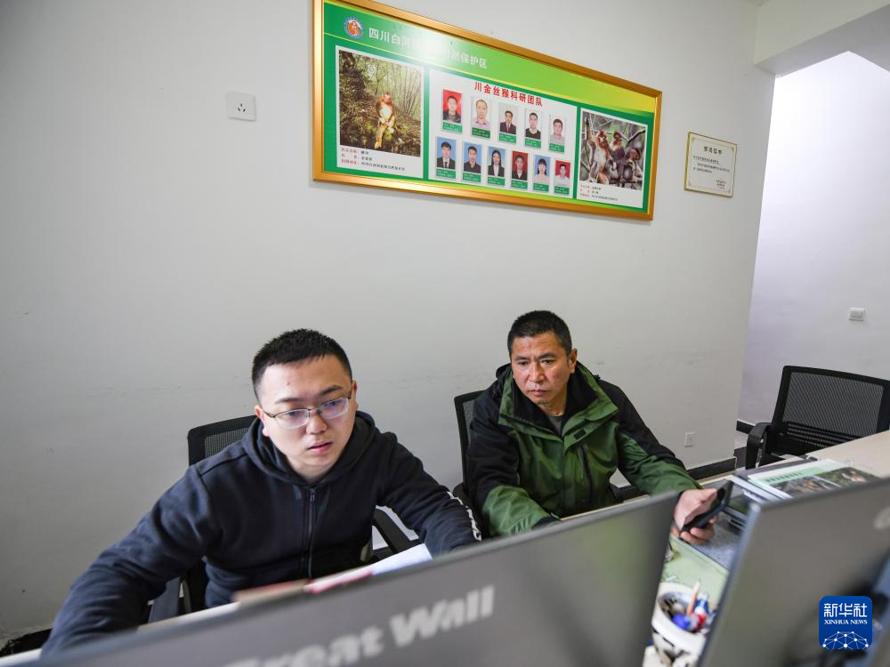 在四川白河國家級(jí)自然保護(hù)區(qū),唐玉林和西華師范大學(xué)生物學(xué)研究生劉昕在辦公室將巡護(hù)記錄的資料錄入電腦系統(tǒng)(10月11日攝)。新華社記者 王曦 攝
