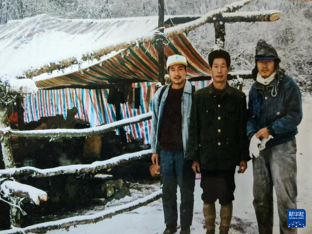 這是1996年唐玉林(左)、父親唐代貴(中)和保護(hù)區(qū)科研人員顧海軍在四川白河國家級(jí)自然保護(hù)區(qū)內(nèi)的合影(翻拍照片)。新華社記者 王曦 攝
